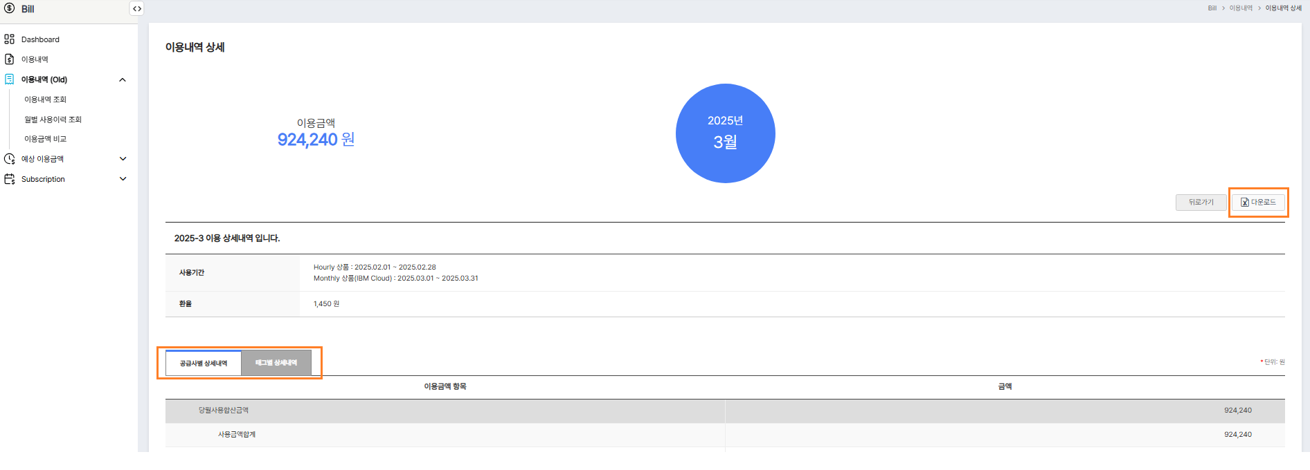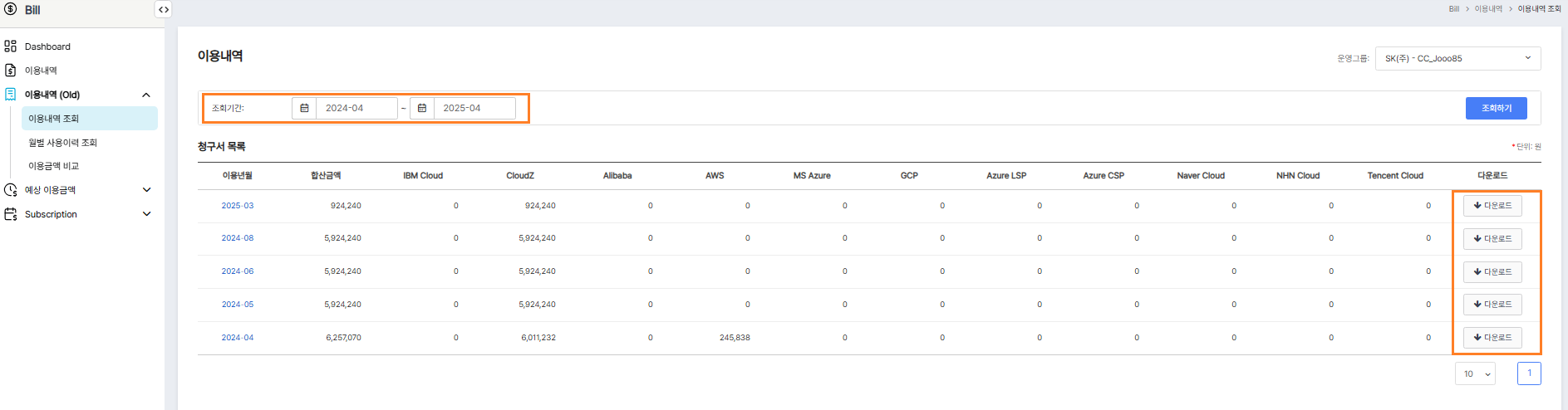 Cloud Z Bill 좌측메뉴 이용 내역 선택 시, 이용 내역 조회 페이지로 이동합니다.